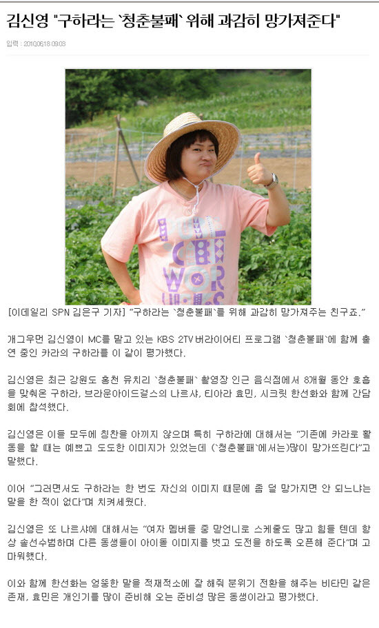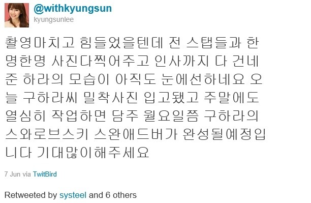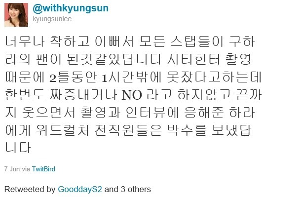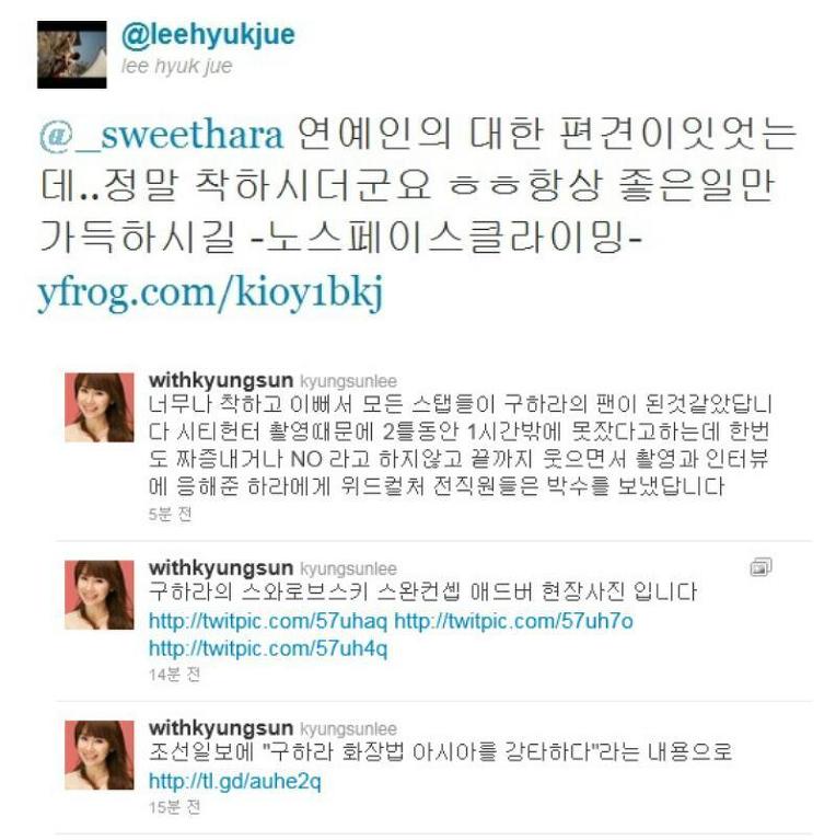 그 는 "잘못된 보도들이 무서워 어떻게 할지도 모르는 바보같은 친구들이지만 서로가 떨어져서는 카라가 될 수 없다고 생각하는 현명한 친구들입니다. 카라 모두가 함께할 수 있게 힘을 주세요. 그리고 회사와 애들 모두 다치게 하는 왜곡된 글들을 경멸합니다"고 응원의 메시지를 남겼다.