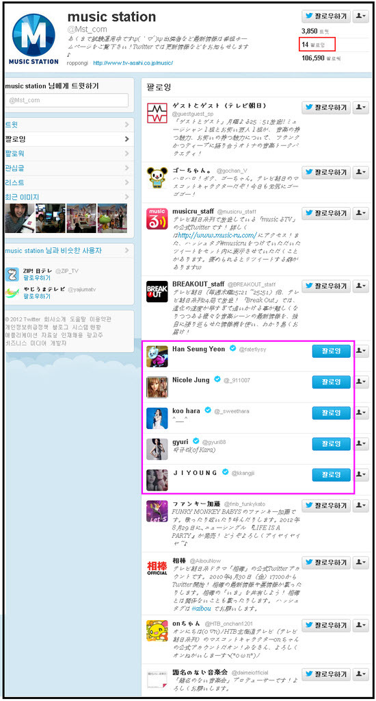 일본 뮤직스테이션의 유일한 팔로잉 14명 중 5명은 카라
